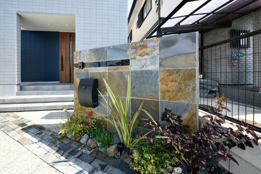 アプローチから玄関までの動線もスムーズに計画し、敷地に対して斜めに配置したおしゃれな門柱が、来客を自然に入口まで導いてくれます。