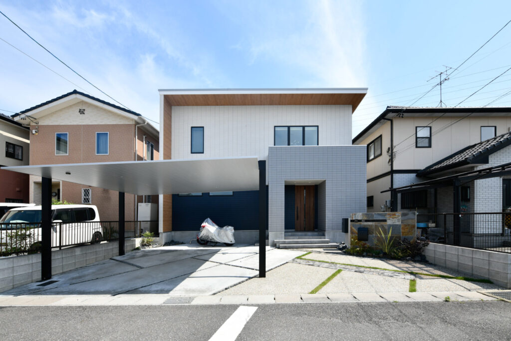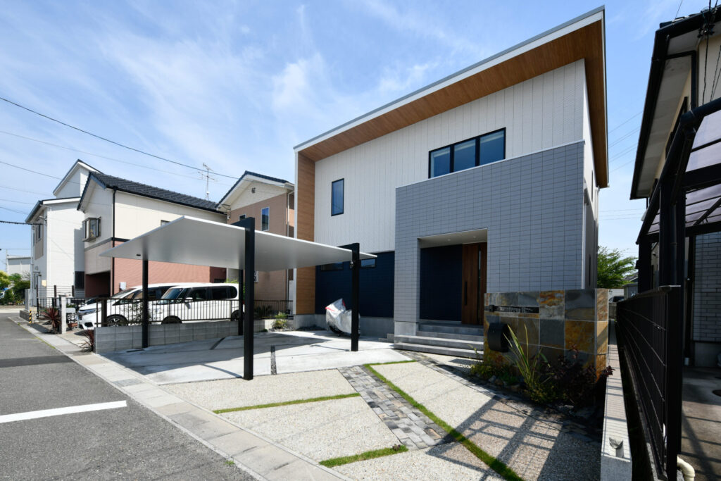 建物のデザインと調和するように設計されたカーポートが印象的な外構。