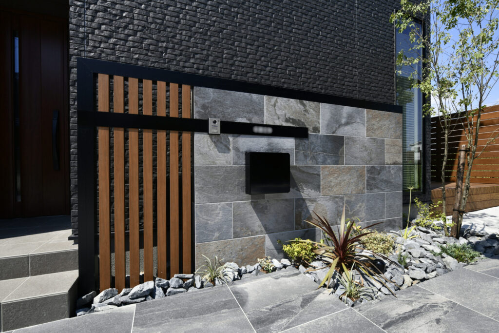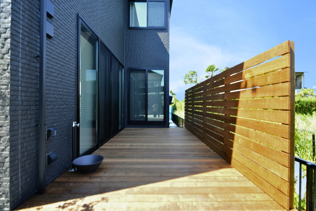 シンプルな構成の中に素材や配置へのこだわりを詰め込み、建物と美しく調和する統一感のあるデザインに仕上げました。ウッドデッキには天然木材を使用し目隠しも同じ素材を採用しました。水栓はOnlyOneのジラーレを使用。門柱を更に際立たせる為にシンボルツリーを取り入れました。