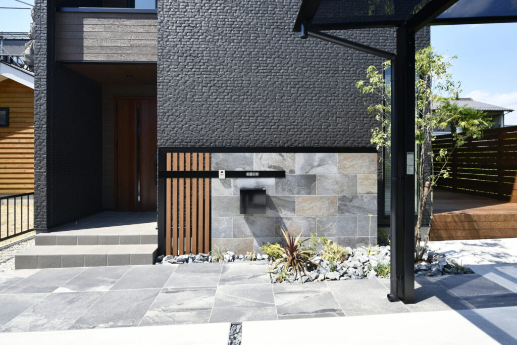 カーポートは三協アルミ「スカイリード」を使用。タイル仕上げのアプローチと駐車場スペースが上質感を高め、シンプルでありながらも印象に残る外構に仕上げりました。