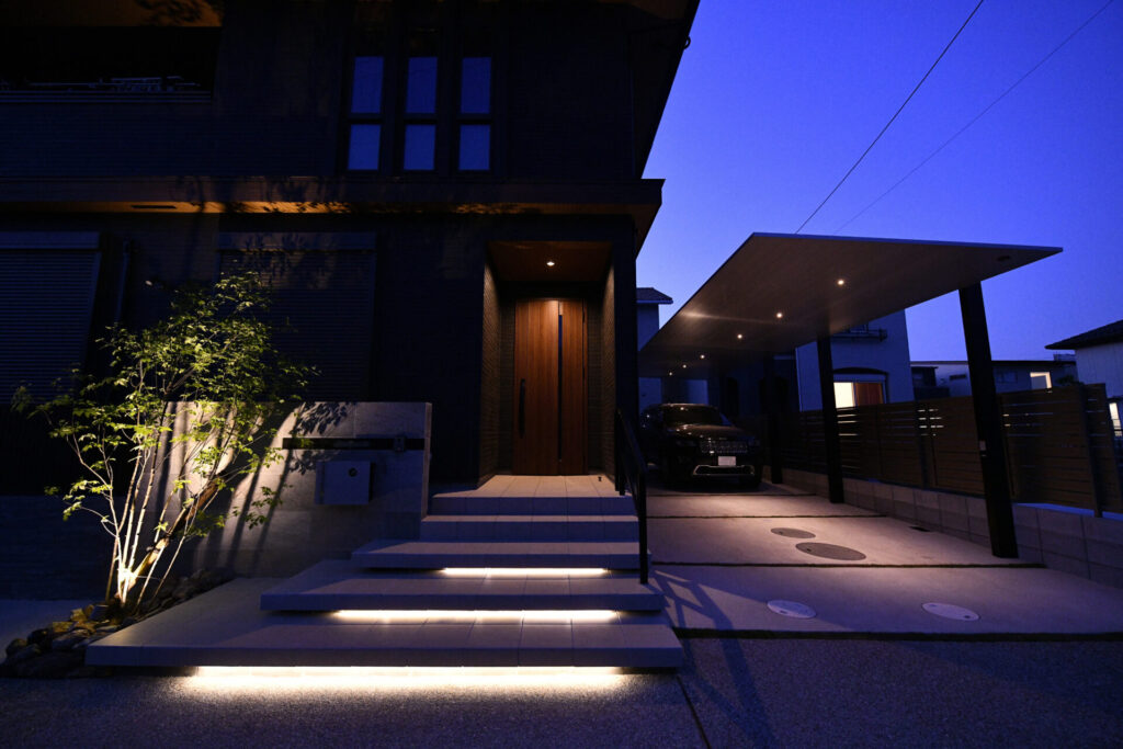 門柱はタイル仕上げ採用。表札はブラックベースにシルバー文字を組み合わせ落ち着きの中に品格を感じさせるデザインにしました。敷地は高低差がありタイルテラスを活かした階段を設け、動線の安全性に配慮しています。夜になると間接照明によって昼と夜で異なる表情を楽しめる外構計画にしました。タイルテラスは単調にならないよう幅や配置に工夫し歩行時の安心感にも配慮。植栽はシンボルツリーを主役にあえて数は抑え管理しやすさとデザイン性の両立を確保。足元には照明を仕込み、屋根や壁面に映し出される陰影が幻想的に演出します。門柱にはポストやインターフォンといった機能を集約しスマート設計に。モダンな美しさと高い実用性を備えた上品な外構の完成です。