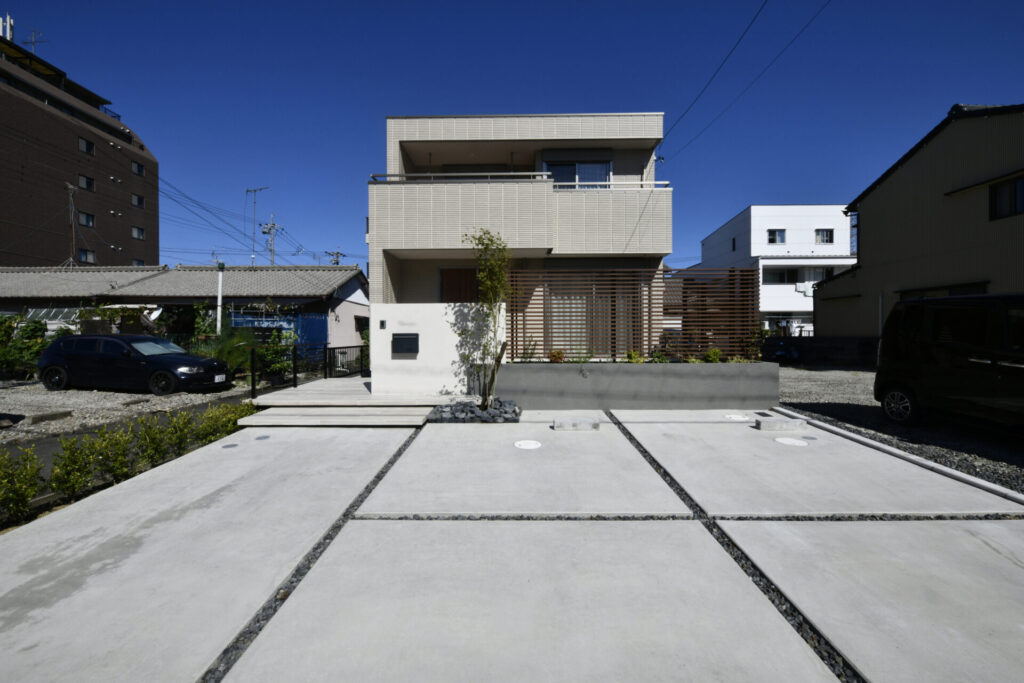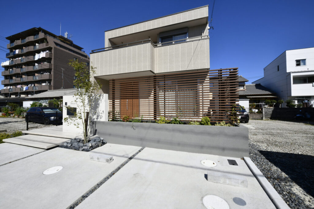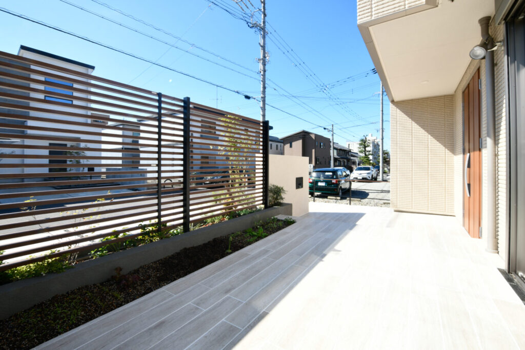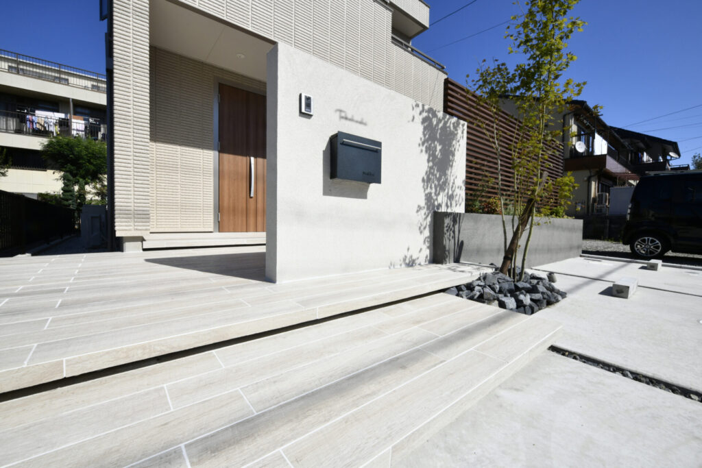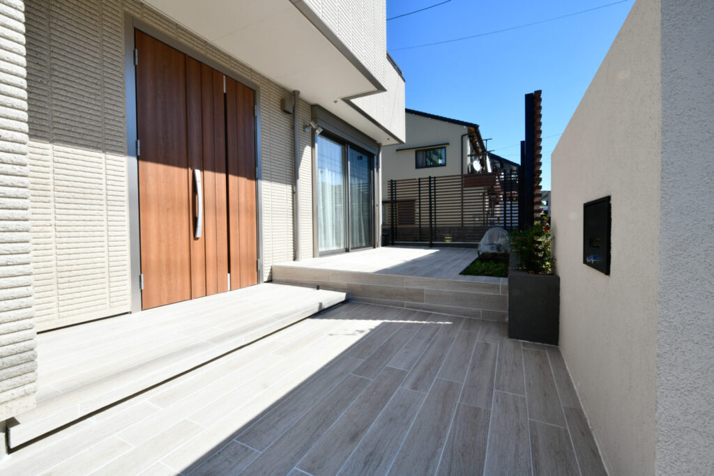 木目調タイルで統一した玄関アプローチからテラスへ続くラインは住まいに温もりを感じます。