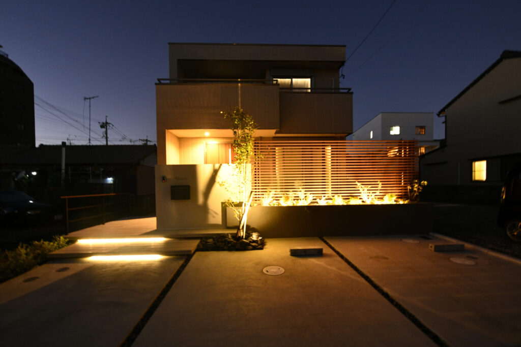 素材選びにこだわり、質感を際立たせることで上質な外構空間を演出。シンボルツリーは「コハウチワカエデ」を植栽。可愛らしい葉が特徴で春夏秋と変化する彩りが玄関まわりを優しく引き立てます。デザインと機能の両立にこだわったプラン。夜は各所に設置した照明がタイルの陰影を際立たせ昼と異なる表情を描き出します。素材の表情と色のバリエーションでスタイリッシュかつ心地よい外構となりました。